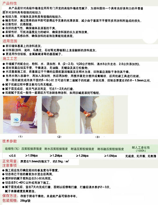 施工前必須先確定底材的垂直及平整度,并先上一遍抗堿封閉劑;攪拌好的膩子應(yīng)在5小時內(nèi)用完;切在5-40攝氏度以外或刮大風(fēng)及下雨天的情況下施工。